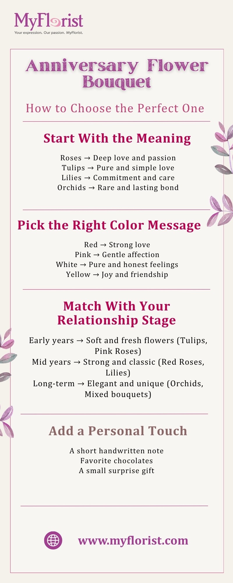 An anniversary flower bouquet can turn a normal day into something special. The best part is that it does not need to be complex. You just need to choose with a clear mind. Roses, lilies, and tulips all carry their own feeling. The color you pick can change the full mood of your gift. This guide helps you understand these small things in a very simple way. MyFlorist offers fresh flowers that are easy to explore. You can also add a message that comes from the heart. A simple idea, done with care, can stay in memory for a long time.
