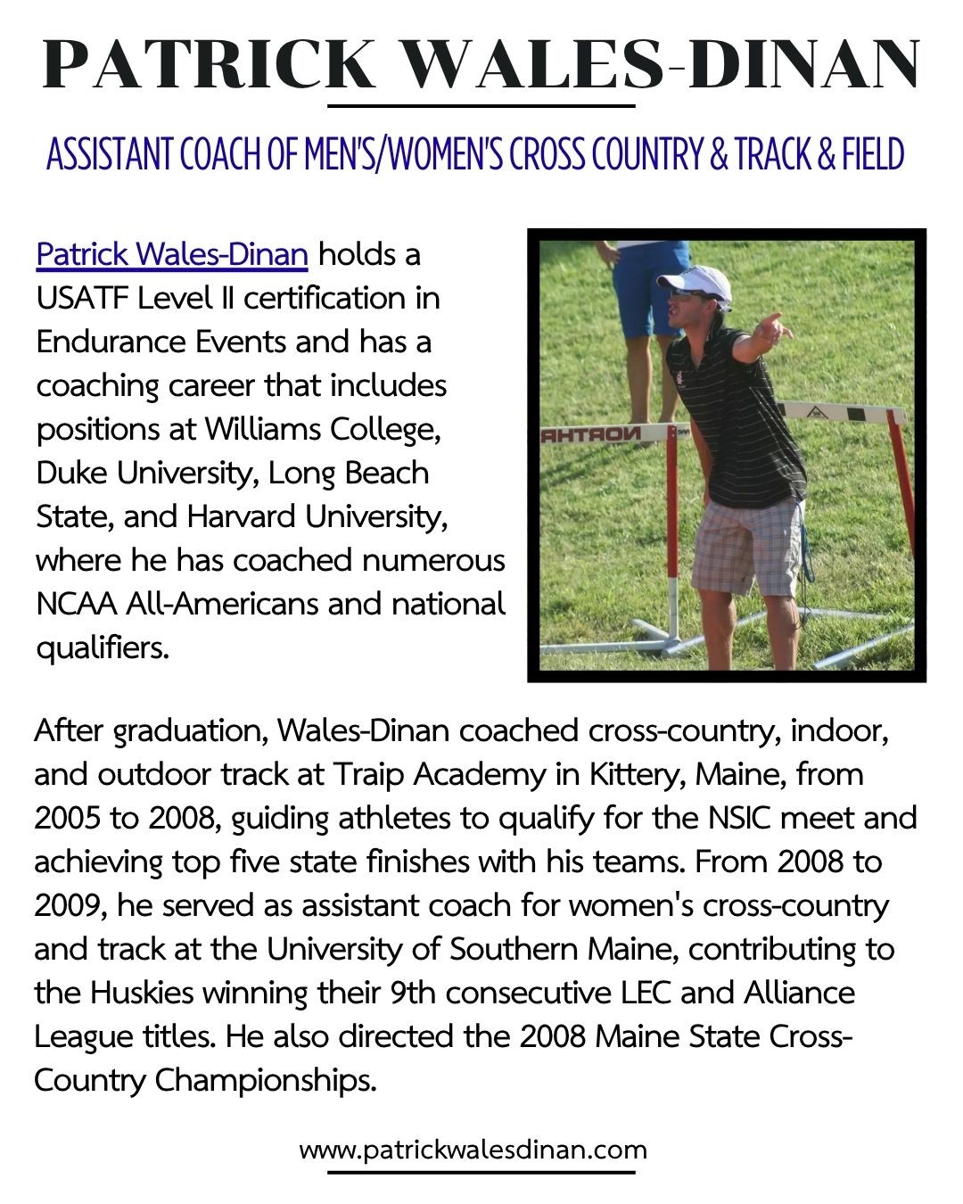 Patrick Wales-Dinan believes sport has the power to change lives, and he is committed to sharing that gift with his community. Through youth clinics, workshops, and motivational talks, he encourages young athletes to discover the joy of running while embracing values like discipline, teamwork, and perseverance.